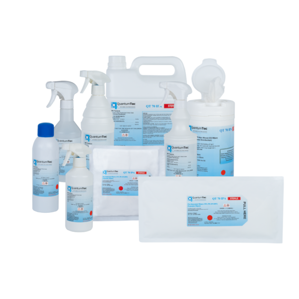 QT IPA 70% (Isopropyl Alcohol) is a general-purpose disinfectant for use in controlled environments. QT IPA 70% is a blend containing 70% USP grade Isopropyl Alcohol (IPA) and 30% USP WFI filtered to 0.22 micron and gamma irradiated to SAL of 10-6. Each bottle is lot number and expiry date coded for complete traceability and straightforward record keeping. Bottles come fully assembled with a non-venting, ergonomic trigger sprayer with mist. The closed system (Bag in a Bottle) spray assembly maintains sterility throughout the products use. All sterile product is individually double-bagged in heat sealed poly bags and packaged in cases with individually sealed double case Liners.