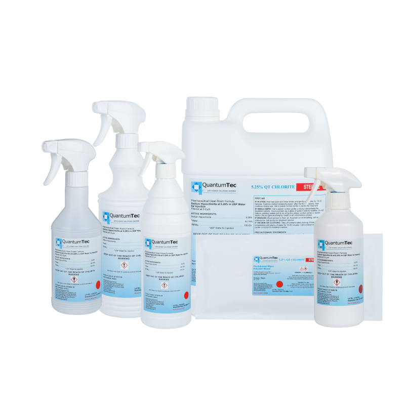 QT Chlorite is a 0.52% Sodium Hypochlorite solution manufactured using USP water for injection (WFI). QT Chlorite is specifically formulated for residue removal and cleaning hard non-porous surfaces in clean rooms or other critical environments including floors, walls equipment, carts, and tables. Bottles are filled and sealed aseptically in an ISO class 5 environment